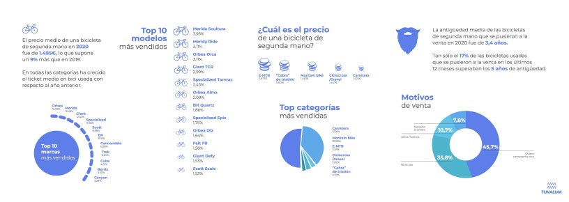 En cuanto a las marcas, Tuvalum muestra cómo Orbea, Merida y Giant han sido las más vendidas en 2020. Especialmente los modelos Merida Scultura, Merida Ride, Orbea Orca y Giant TCR. Curiosamente, el top 5 de los modelos más vendidos del mercado de segunda mano se usan para el ciclismo de carretera. En lo que compete a las mountain bike, la Orbea Alma y la Specialized Epic han sido las más deseadas.
