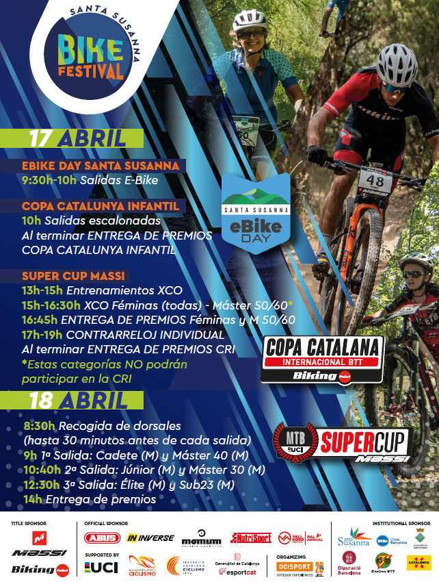 La cita de Santa Susanna de la Super Cup Massi vuelve a ser puntuable para el ranking UCI, siendo de categoría UCI C1, con las carreras de XCO. Por si fuera poco, el sábado habrá una contrarreloj puntuable para la general de la Copa Catalana Internacional Biking Point. Los mejores ciclistas del mundo se verán las caras en el siempre exigente recorrido, que presentará algunas modificaciones.