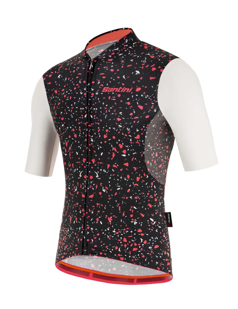 Maillot Santini ideal para condiciones de calor extremo, fabricado con tejidos Polartec. Delta Pietra está confeccionado con Polartec© Power Stretch, un tejido transpirable y extremadamente flexible, gracias a su estructura elástica en 4 direcciones. El panel inferior, salvo la zona de los bolsillos, y la zona de las axilas están fabricados en Polartec© Delta, que actúa como sistema de enfriamiento y facilita la transferencia de calor del cuerpo, gestionando el sudor. El maillot Delta Pietra está concebido para pedalear en los días de altas temperaturas. Las mangas no tienen dobladillo. Se adhieren sin apretar y el maillot se queda en su sitio gracias a la banda elástica de color de la parte inferior del maillot. Está disponible en cuatro colores (negro, azul marino, verde militar y gris plateado) con un estampado moderno y atractivo.