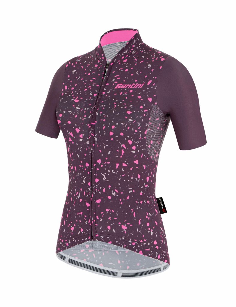 Maillot para mujer firmado por Santini y confeccionado con Polartec© Power Stretch, un tejido transpirable y extremadamente flexible, gracias a su estructura elástica en 4 direcciones. El panel inferior, salvo la zona de los bolsillos, y la zona de las axilas están fabricados en Polartec© Delta, que actúa como sistema de enfriamiento y facilita la transferencia de calor del cuerpo, gestionando el sudor. Esta combinación de tejidos hace que el maillot Delta Pietra sea ideal para las salidas estivales con mucho calor. Las mangas no tienen dobladillo. Se adhieren sin apretar y el maillot se queda en su sitio gracias a la banda elástica de color de la parte inferior del maillot. Está disponible en cuatro colores (negro, azul marino, vino y gris plateado) con un estampado moderno y atractivo.