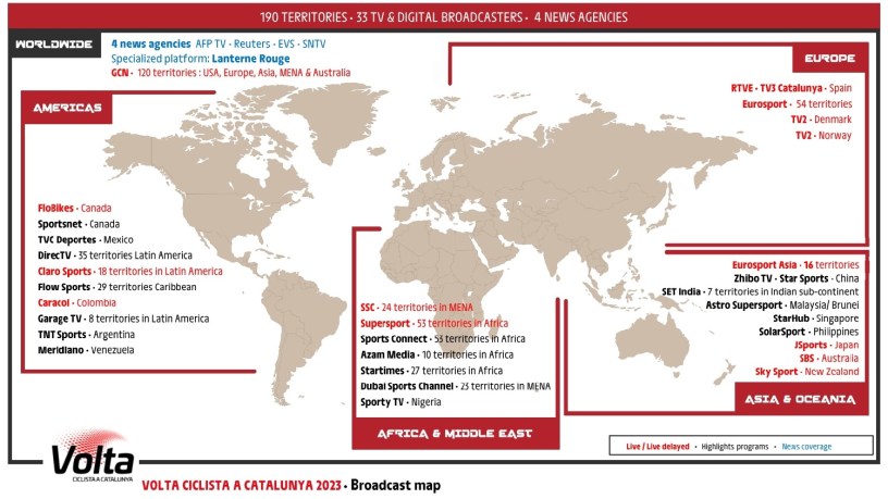 Las imágenes en directo de la 102ª edición de la Volta Ciclista a Catalunya llegarán a 190 territorios en todo el mundo gracias a su difusión a través de 33 difusores de televisión y digitales y de 4 agencias de noticias, tal como muestra el mapa de difusión televisiva de ASO, empresa que comercializa los derechos televisivos de la prueba.